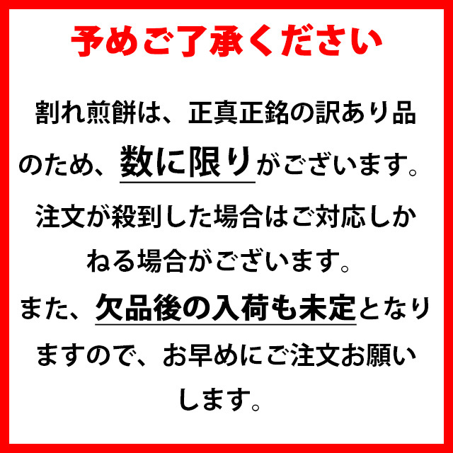 割れせんべいは、正真正銘の訳あり品のため、数に限りがございます。注文が殺到した場合はご対応しかねる場合がございます。また、欠品後の入荷も未定となりますのでお問合せ頂いてもお応えできかねます。予めご了承ください。