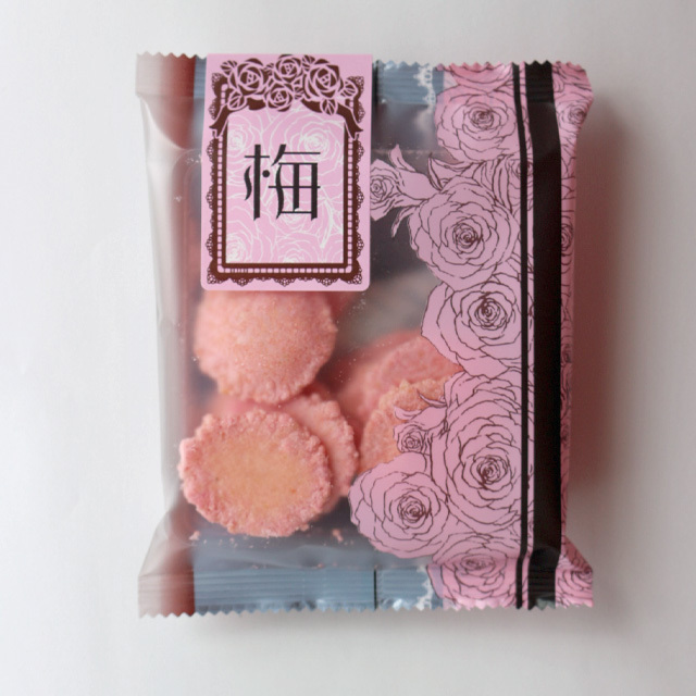 ほんのりすっぱい梅の香りたっぷり。可愛らしいピンクのお煎餅は見ているだけでも楽しくなります。