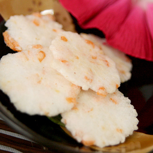 塩味のえびせんべいに、うにがたっぷり入った贅沢なお煎餅です。うに独特の海の香りをお楽しみください。
