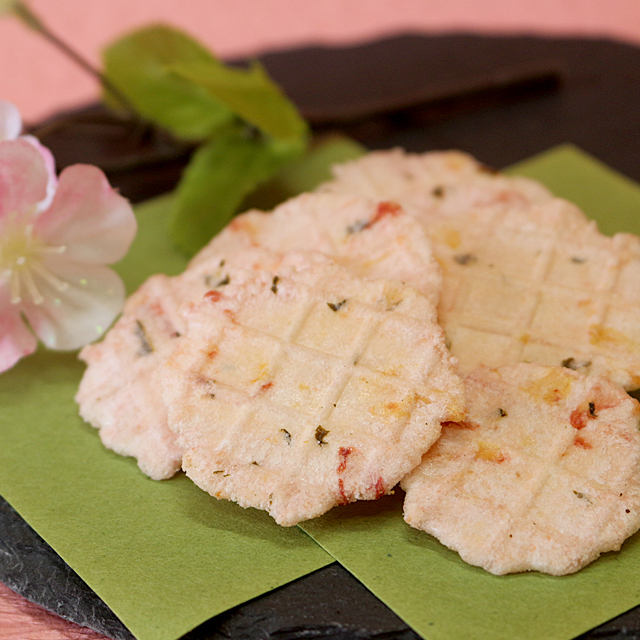 まるで桜餅のような味わいのおせんべい。春らしいピンク色でかわいいお菓子です/ 内容量:12g入り / 賞味期限:90日間 / 原材料:馬鈴薯澱粉,えび,桜葉,小麦,食塩,植物油,コーンスターチ,ベーキングパウダー,みょうばん/調味料(アミノ酸等),甘味料(ステビア,天草)、紅麹,酸化防止剤 栄養成分表示(100gあたり) 熱量:433kcal / たんぱく質:3.8g / 脂質:10.3g / 炭水化物:81.2g / 食塩相当量:1.40g ※上記の数値は目安です。