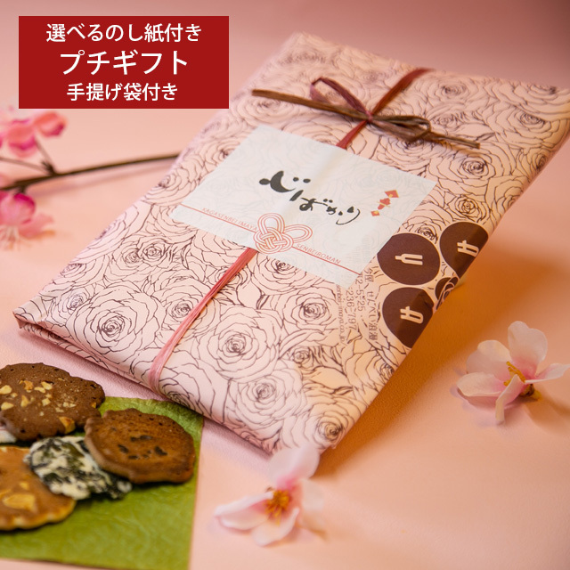 種類別に食べきりサイズのお煎餅「金沢百縁煎餅」が、和紙の熨斗紙付きでぷちギフトになりました。お煎餅の種類・のし紙は選ぶことが可能です。/種類:珈琲煎餅とるてぃやん、チョコっと煎餅、ピーナッツ、わかめ、かに、ごぼう、小柴舟、かぼちゃ、ごま/のし紙:ほんの気持ち、心ばかり、祝、ありがとうございました/